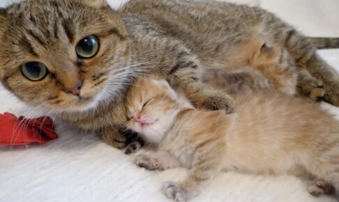 傍目にはとても眠っているとは思えないほどの寝相なので、兄弟猫もちょっと心配になってしまったようで、自分のからだを爆睡中の子猫に寄り添わせて、だいじょうぶにゃ〜?と確認しているような仕草をしています。