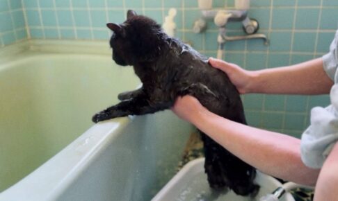 外で盛大なゴロンゴロンで全身灰だらけな黒猫はお風呂直行!