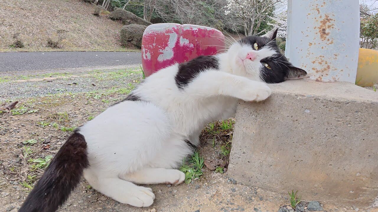 ハチワレ猫は警戒するどころか、撫でてもらってからは甘えん坊モードを発動。
