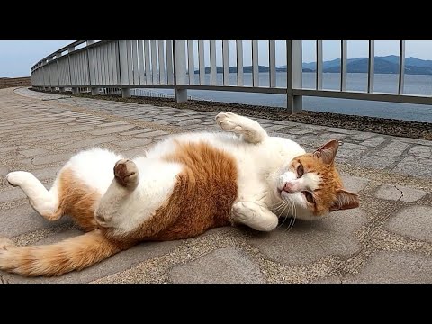 遊歩道に野良の茶色猫ちゃんが横たわっていました。
