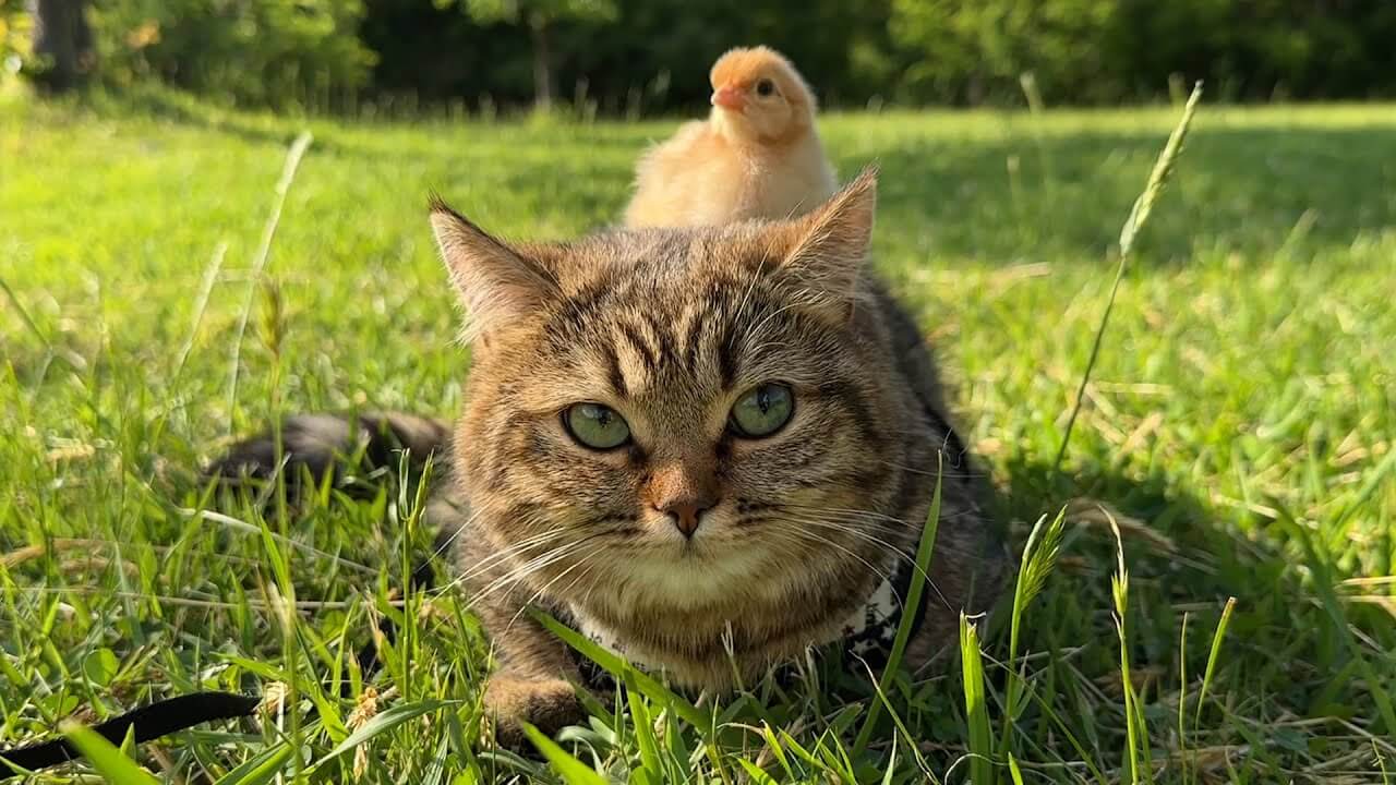 パパ猫は傍にいるヒヨコ達を守りたいという気持ちもあるのでしょう。