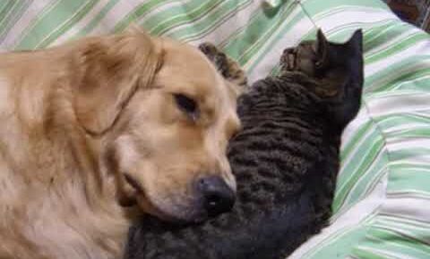猫を枕代わりにお昼寝してしまうゴールデンレトリバー