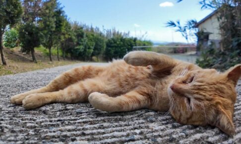 天気の良い気持ち良い日なので坂道のどまんなかで全身に太陽の光を浴びて日光浴を楽しんでいるようです。