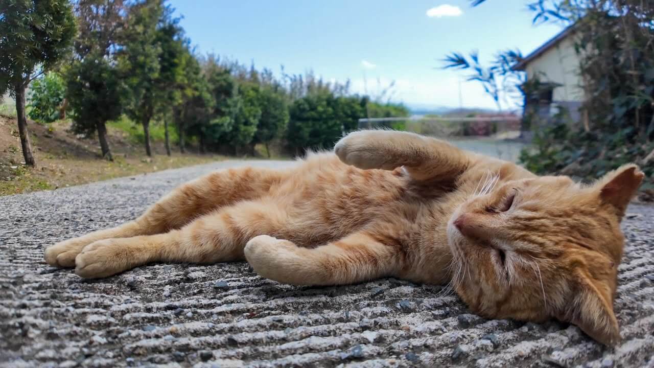 緑に囲まれた山道のような坂道のど真ん中に茶トラの猫さんがどっかりと横たわってまったりしています。