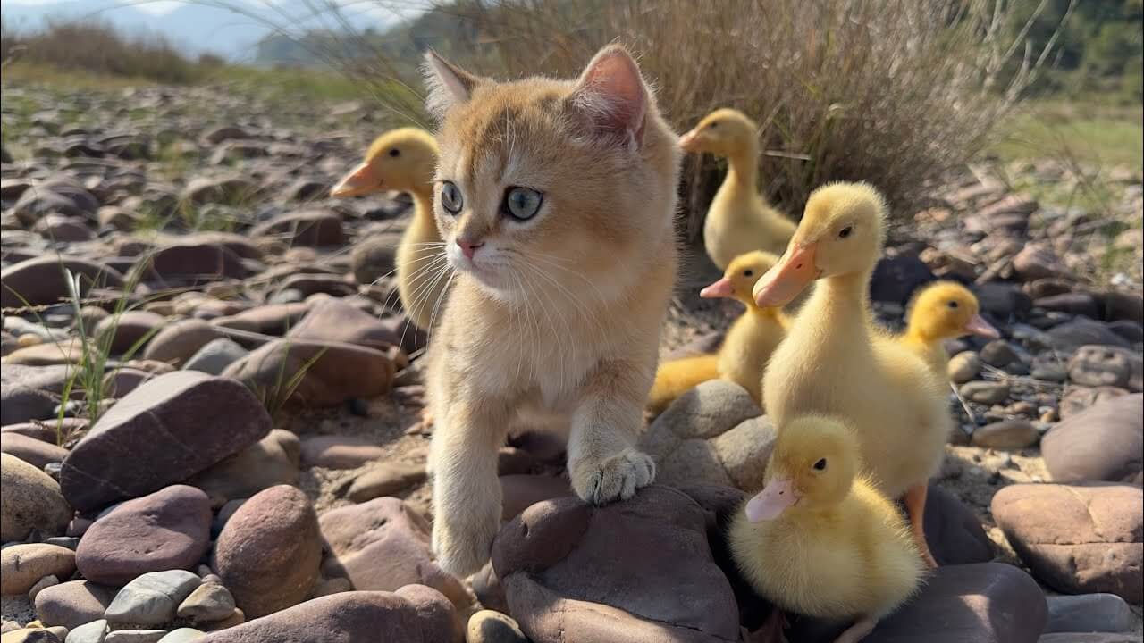 石がゴロゴロしている河原のような場所の道なき道をぐんぐんと進んでいる子猫と、そのあとをトコトコと早足でついてくるアヒルの子たち。子猫は、この道に詳しいようで、迷うことなく突き進んでいきます。