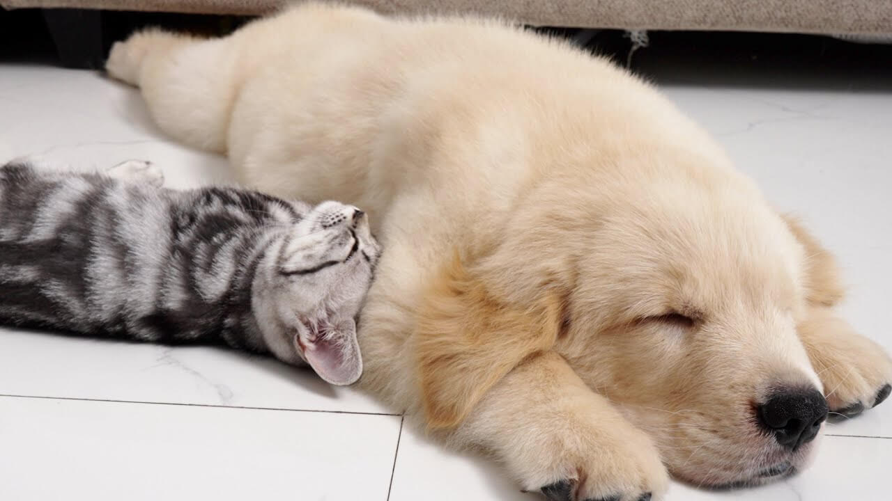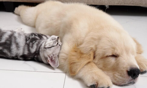 ゴールデンレトリバーの子犬が床の上で伏せてぐっすり昼寝しています。そのそばにはアメリカンショートヘアの子猫がぴたりと寄り添っています。