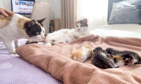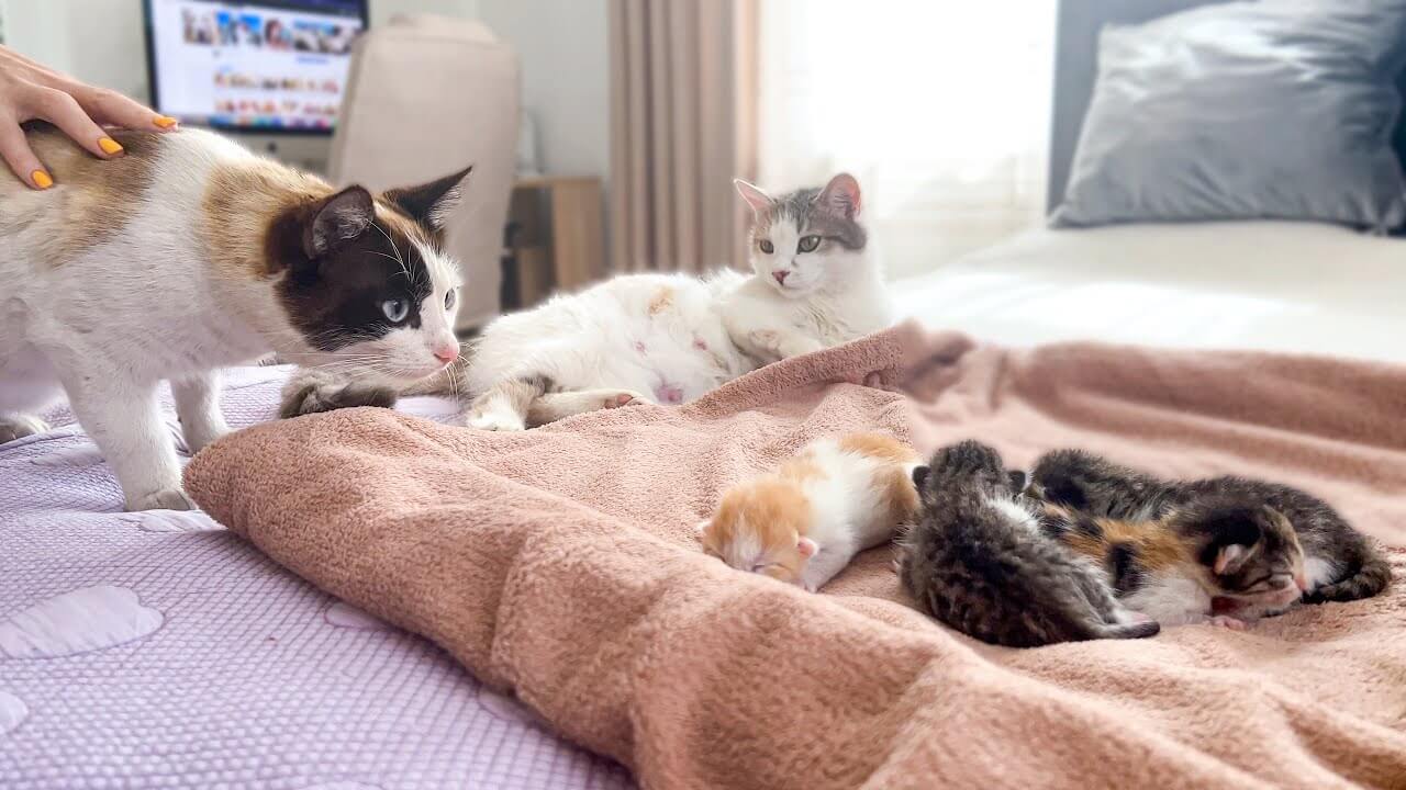 ベッドの上には、まだ目も開いていない可愛い赤ちゃん猫たちがいます。そばにはお母さん猫が寄り添っていて赤ちゃん猫たちを見守りながら自分の毛づくろいをしています。