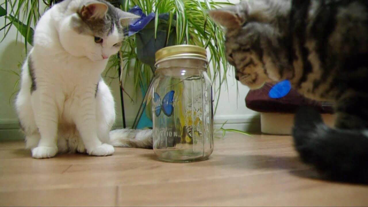 猫たちがガラスのメイソンジャーをじっと凝視しています。ジャーの中には青い蝶々が入っていてそれに釘付けになっているようです。