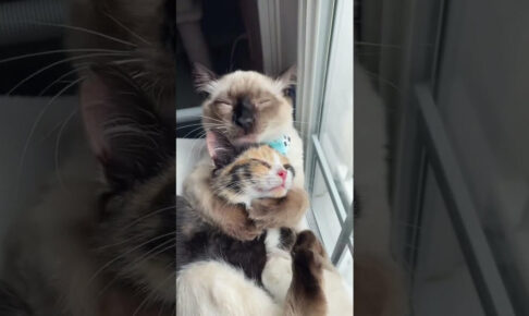 また黒猫の子猫がベッドに入ってくると、この子のことも優しくお世話をしてあげている先住猫さんです。