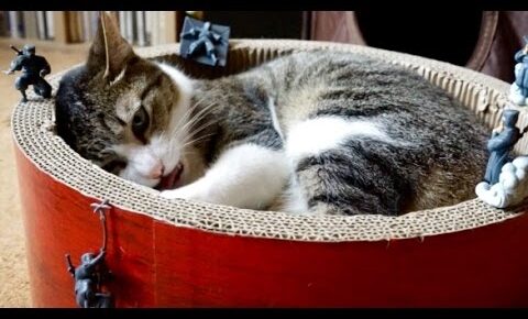 爪研ぎ器の中に入ってくつろいでいたら、知らぬ間にフィギュアに囲まれていました。