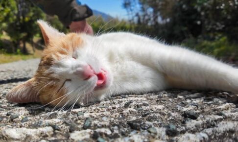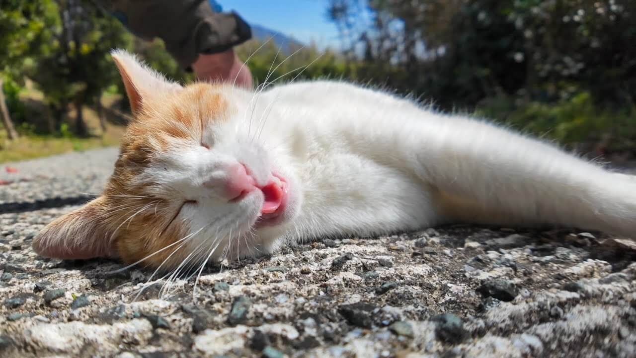 鮮やかな緑に囲まれた坂道を歩いていくと、茶トラの猫さんが石畳の上でゴロンと横になり超リラックスモードになっていました。