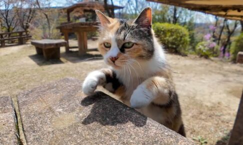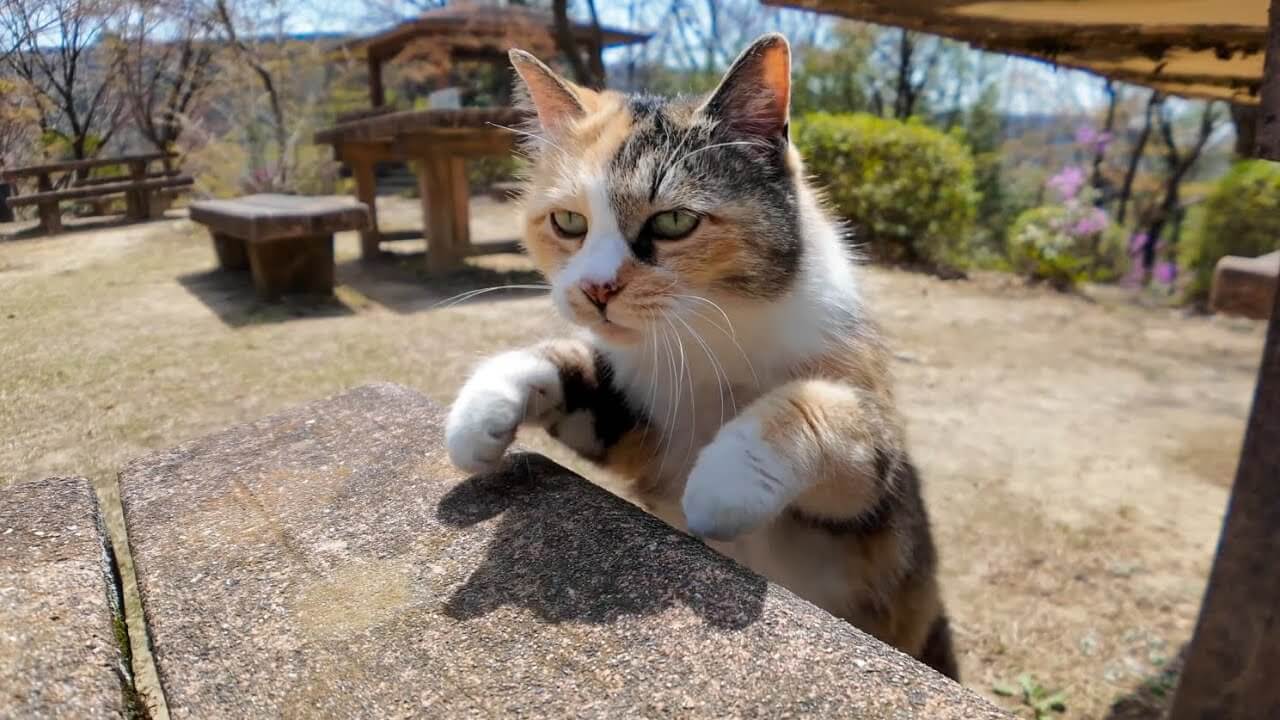 撮影者さんが山頂の広場にあるテーブルでのんびり過ごしていると、野良の猫ちゃんがやってきました。