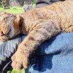 再び背伸びを思いっきりしたら、そのままぺったんこのポーズになりました。もともとぽっちゃり猫さんなので体が重くて動くのも面倒〜っていう感じですね。