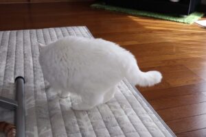 椅子の下で、なんだか寂しそうな顔をしている子猫のミコちゃんです。遊び相手もいなくて、つまらないのかもしれません。そこで飼い主さんが手を動かして遊びに誘ってみます。