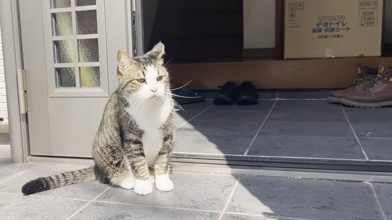 お母さんにスリスリしながら、早くドアを開けてにゃ〜と喉をゴロゴロ鳴らしています。ドアを開けてもらうと勢いよく外に飛び出したオデコでしたが、玄関先からはなかなか動きません。