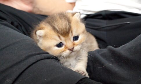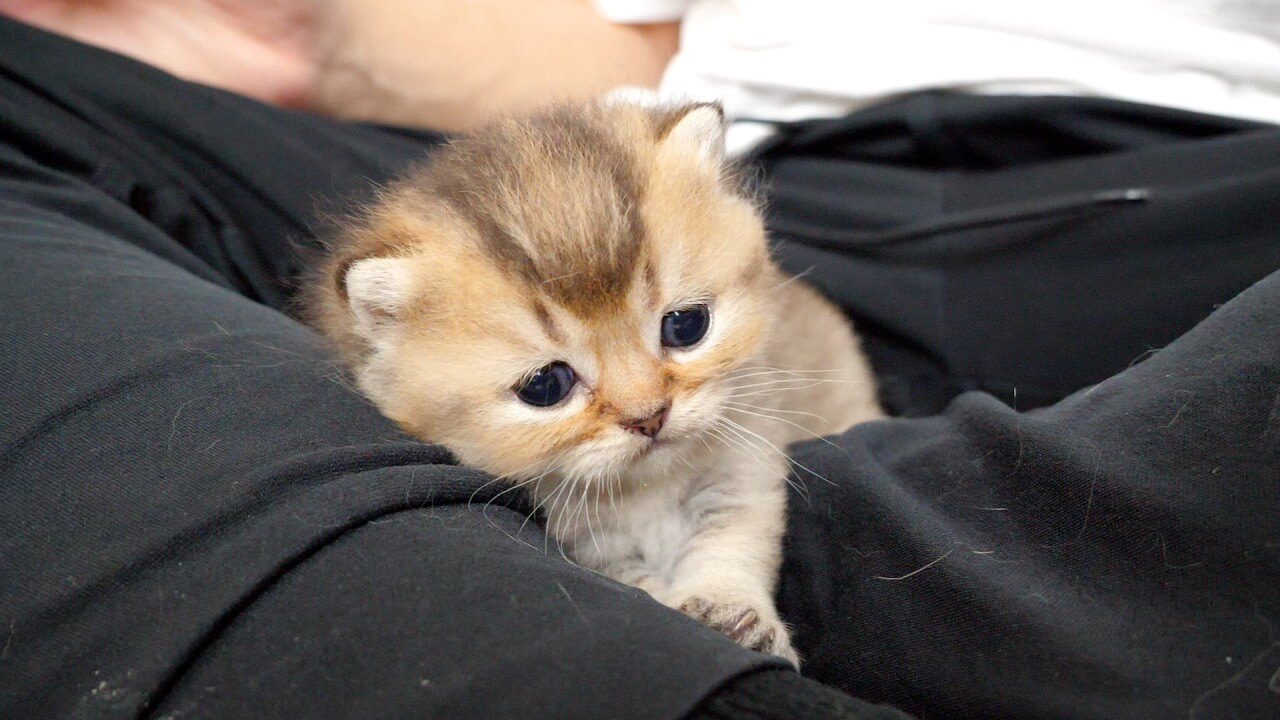 たくさん歩き回ったらお母さん猫のところに戻ってミルクを飲んだりしますが飼い主さんの膝の上に乗っかってきたりもするようになりました。