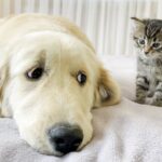 ベッドでくつろいでいるチワワのそばに、小さな子猫がちょこんと座っています。チワワも小さな犬ですが、それよりもさらに小さな子猫はめちゃくちゃ小さいことがわかります。