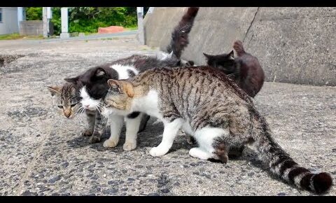 いつのまにやら、猫の数は何匹にも膨らんでいって、振り返れば背後にはたくさんの猫たちが追いかけてきていました。やがて防波堤に到着したご一行様です。