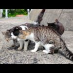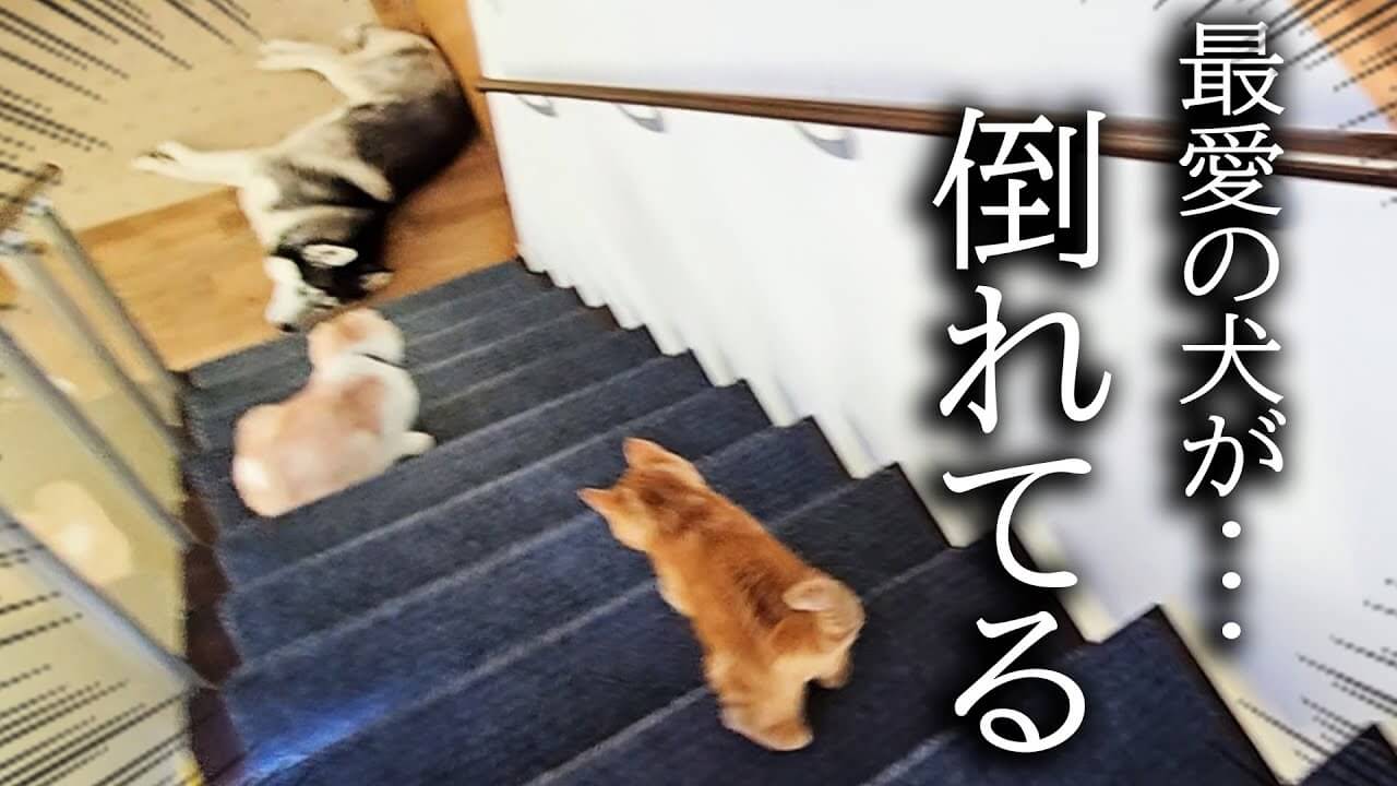 パトロールを終えて遊んだら疲れてしまったはっちゃんが階段下で寝転がっていると子猫の茶太郎が倒れてしまったのではないかとやけに心配しています。心優しい性格の子猫茶太郎が可愛いですね。