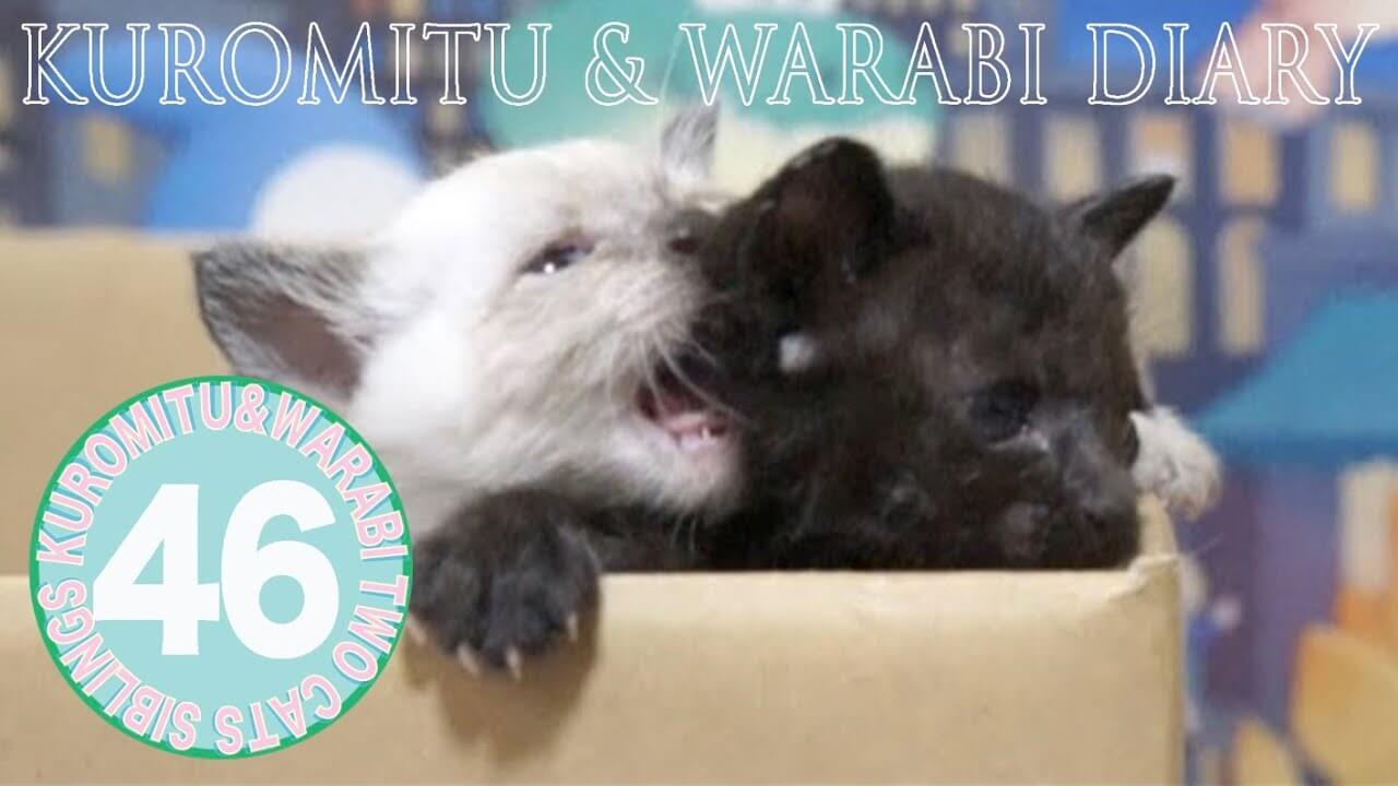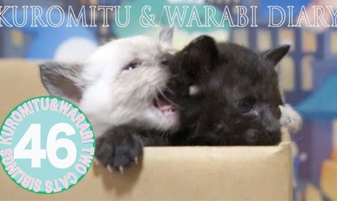 黒猫の子猫がダンボール箱からひょっこり可愛い顔をのぞかせています。黒猫の名前はくろみつでシャムっぽい子猫のほうは、わらびです。