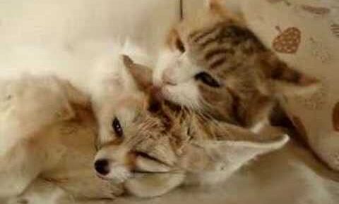 フェネックを我が子のようにお世話する三毛猫母さん