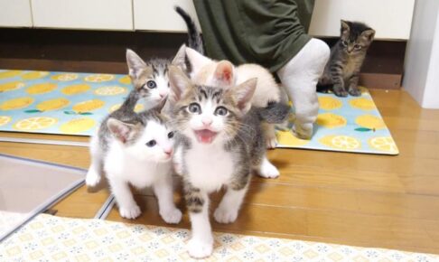 お腹を空かせた子猫たちが続々とキッチンに集まってきましたよ〜。ニャーニャーの声が1匹から2匹へと増えるとなかなか迫力のある合唱隊になります。