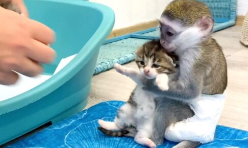 掃除後に子猫ちゃん達を戻そうとするも、お猿さんが子猫ちゃんを抱きとめて離そうとはしません。