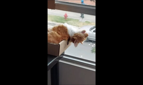首はダンボールの淵のところで直角のように曲がっていて、とても安眠しているようには見えません。