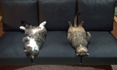 ソファの上でも仲良くヘソ天ポーズで寝転がっていたり。秋には紅葉を一緒に楽しむ仲良し兄妹です。