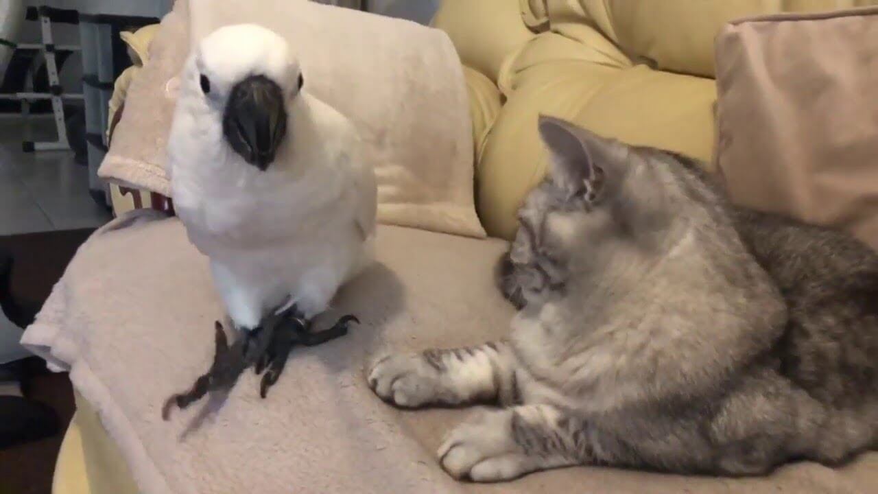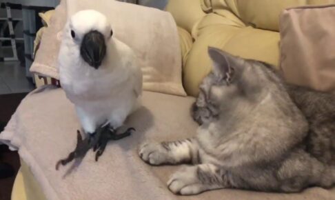 今回ご紹介するのはお昼寝をオウムに邪魔されてしまう猫ちゃんです。