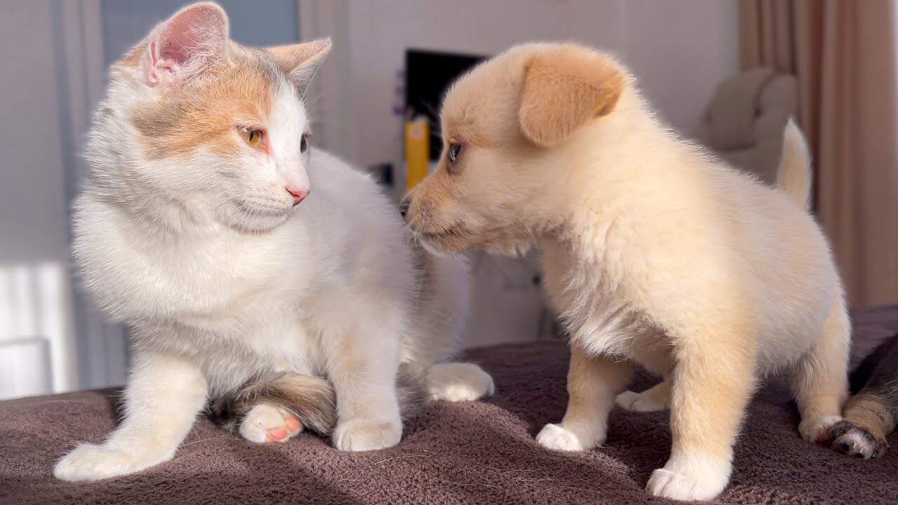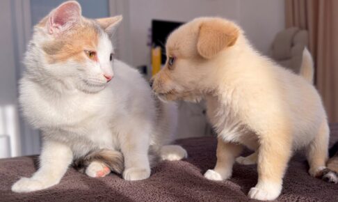 今回ご紹介するのは猫ちゃんと子犬達は初対面シーンです。