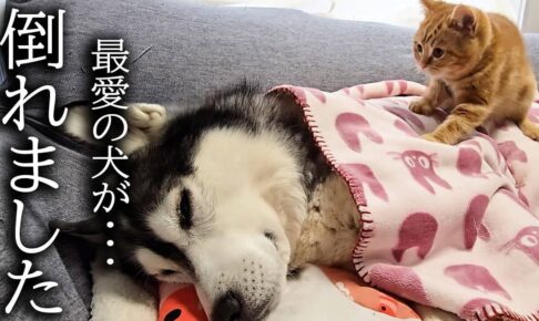 すると一緒に暮らす愛猫達はハスキーを心配し、大丈夫ニャ?と心配そうに見守っていました。