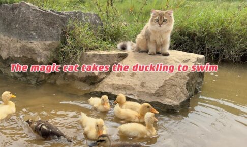 アヒルの子達は楽しそうに水の中へ入って泳ぎ、猫ちゃんはその様子を見守ります。