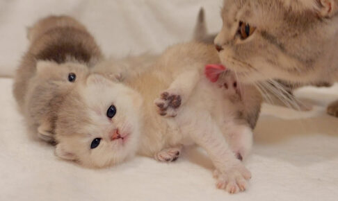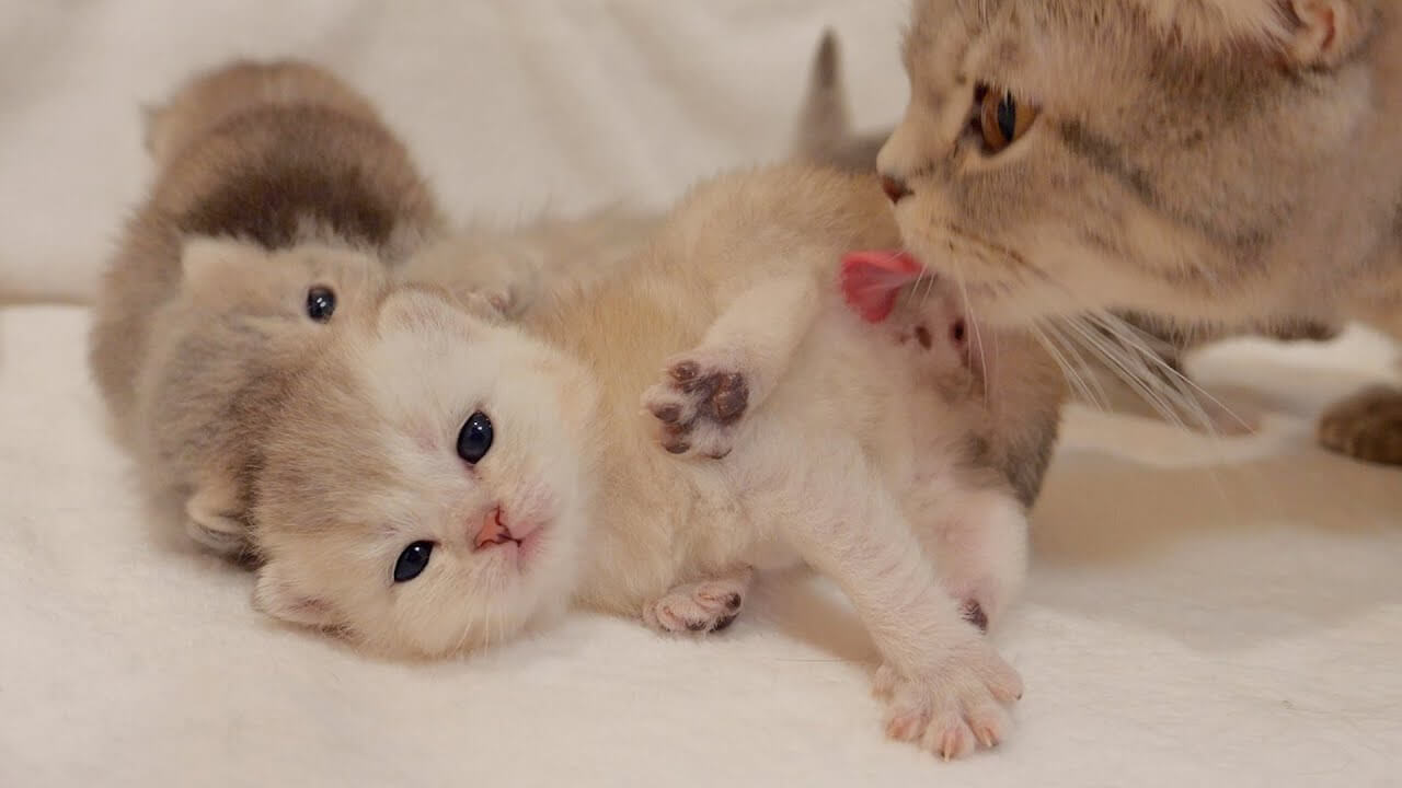 寝床に子猫ちゃん達が寝転がっており、母猫は子猫ちゃんをペロペロと毛づくろいしていました。