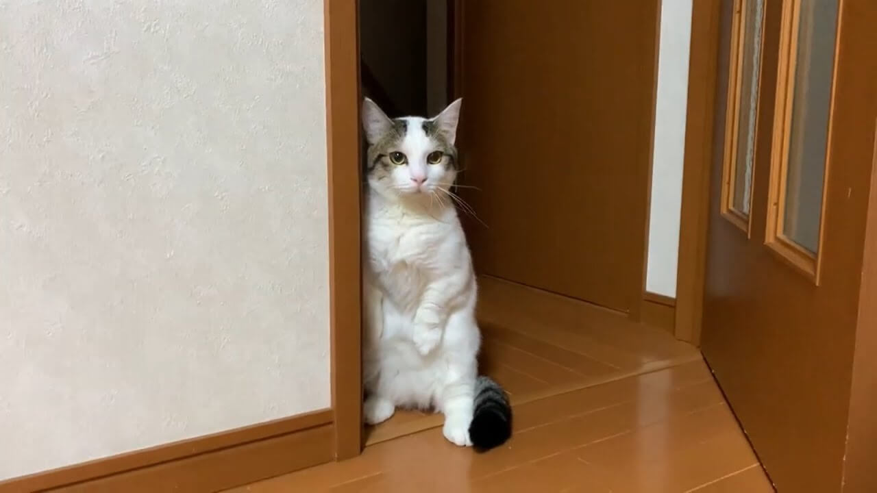 その鳴き声を聞きつけ、豆大福が部屋の入口へとやってきます。