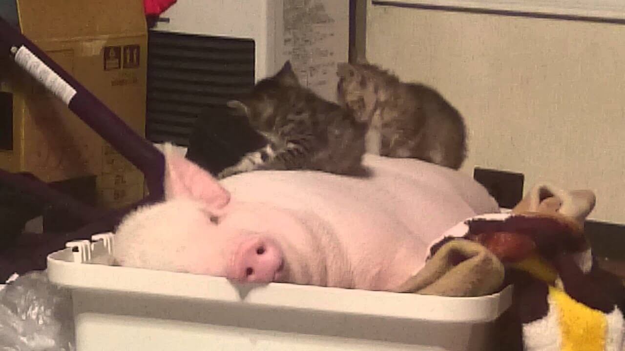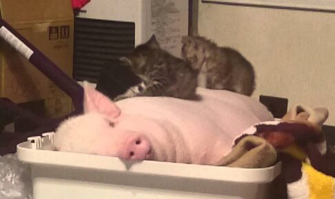 ミニ豚さんのもちもちなお腹の上ではしゃぐ子にゃんず