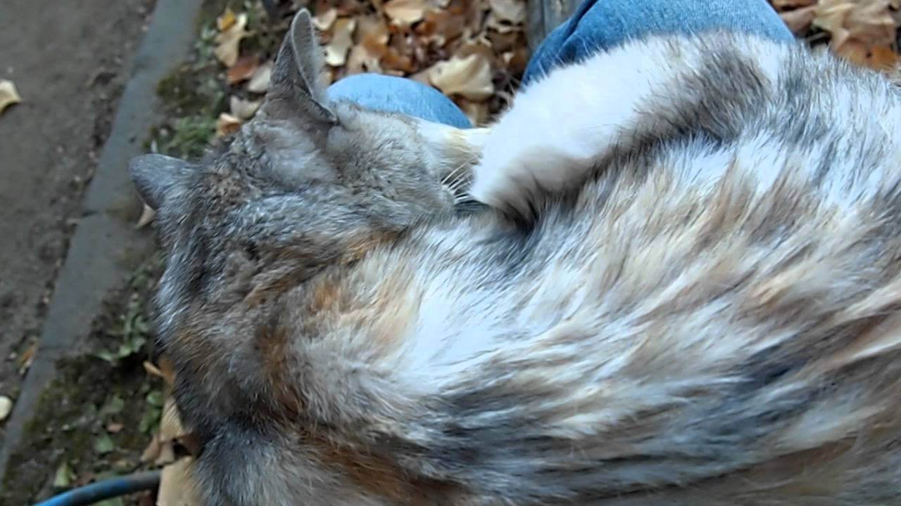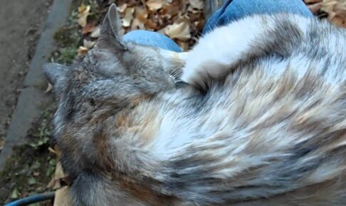 膝の上でまんまるく丸まって昼寝をしている猫さん。あまりにも気持ちよさそうに寝ていましたが、主さんもそろそろベンチから立ち上がり帰りたくなりました。