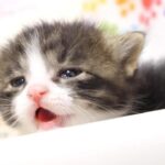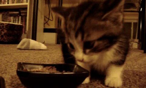 すると美味しそうな匂いにつられて子猫がトコトコと走り寄ってきます。お皿の上のフードを見つけるとすぐにガブガブと飲み込む子猫は、かなりお腹が空いていたようです。