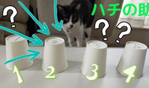飼い主さんが紙コップに鈴を入れて紙コップを移動させて、ハチワレ猫ちゃんが鈴の入った紙コップを選んで当てるゲームです。