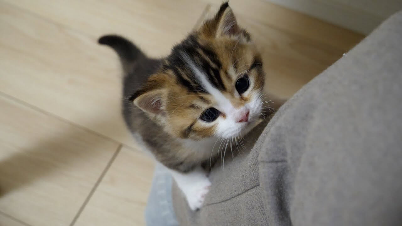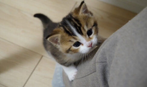 毛繕いも無事に終わると、子猫のニコは飼い主さんの足に登ってきました。