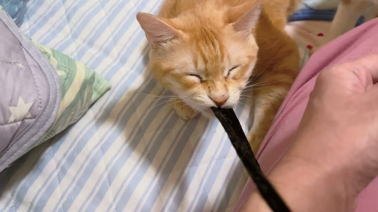 飼い主さんが手首につけている髪ゴムの端っこをがっちりと咥えている茶トラ猫のミルクくんです。かなり力強くゴムを噛んでいて、離すまいと必死になっているようです。