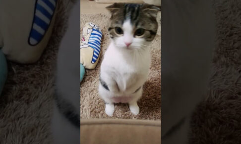 マンチカン猫の鉄朗くんが後ろ足だけで器用に立ち上がっています。マンチカンは短足な猫さんなので後ろ足だけでもとても安定して立っていることができるのです。