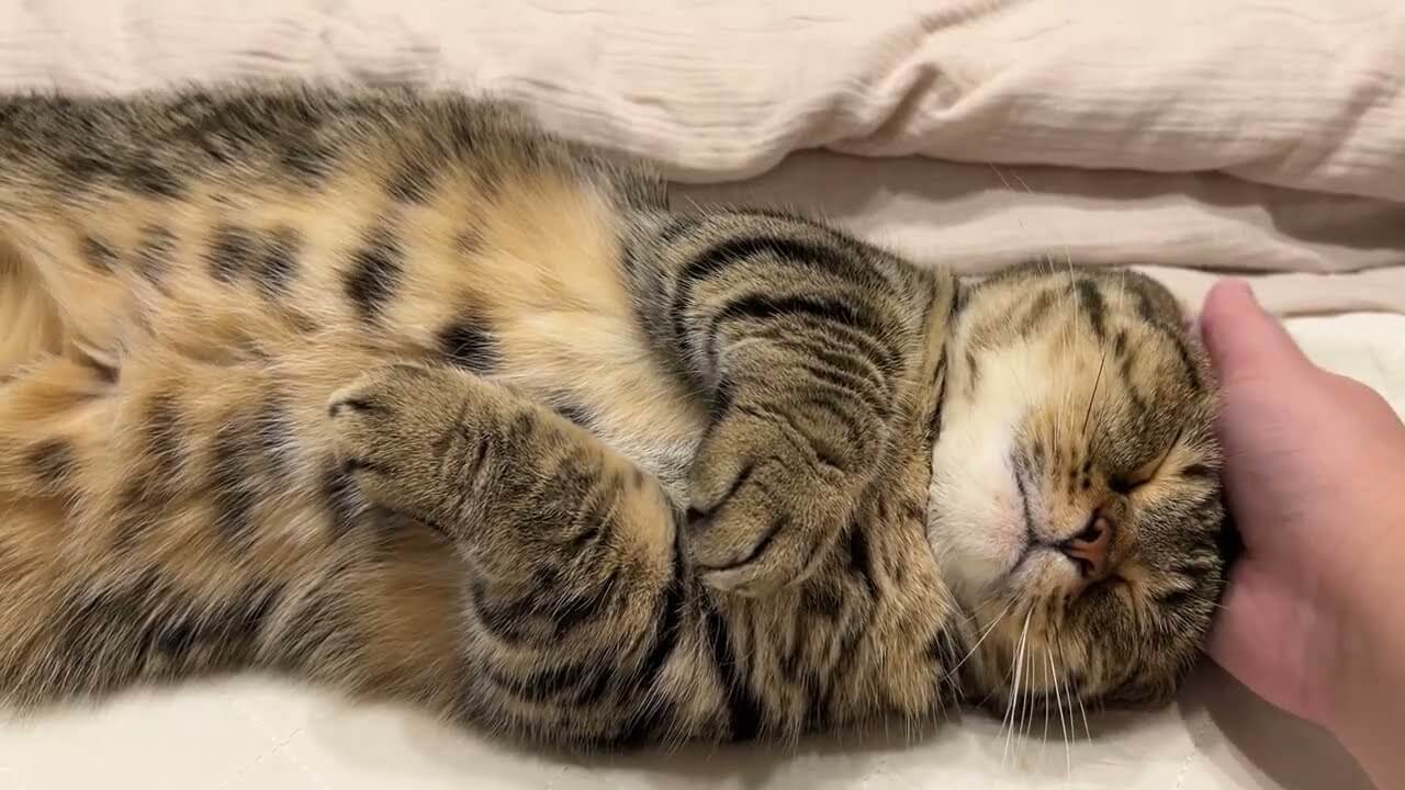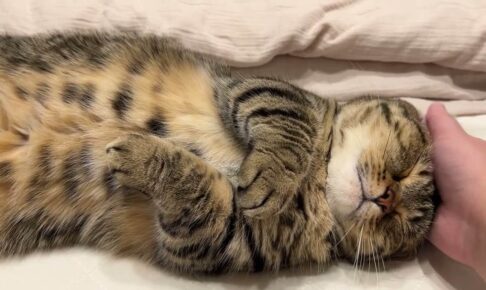 このキジトラさんも、撫でられている間は、完全に体がとろけてしまってしびれてしまったみたいに飼い主さんの魔法のマッサージから逃れられなくなってしまっているのです。