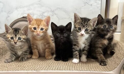 生後1ヶ月目の子猫たちがケージの中でごはん待ちのスタンバイ!ごはんが並べられると一気にケージから飛び出してきて兄弟同士で皿取り合戦が始まります。