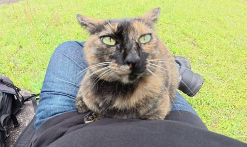 公園の大きな石の上に座っているとサビ猫さんがやってきて、ちゃっかり膝の上に乗っかってきました。