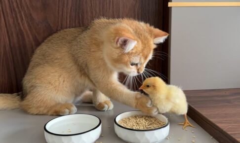 子猫は食事中のひよこが、ごはんの上に乗っかって食べているのが気になるらしく何度もひよこの頭を叩いて、ごはんの上から降りるにゃ〜と指導しています。