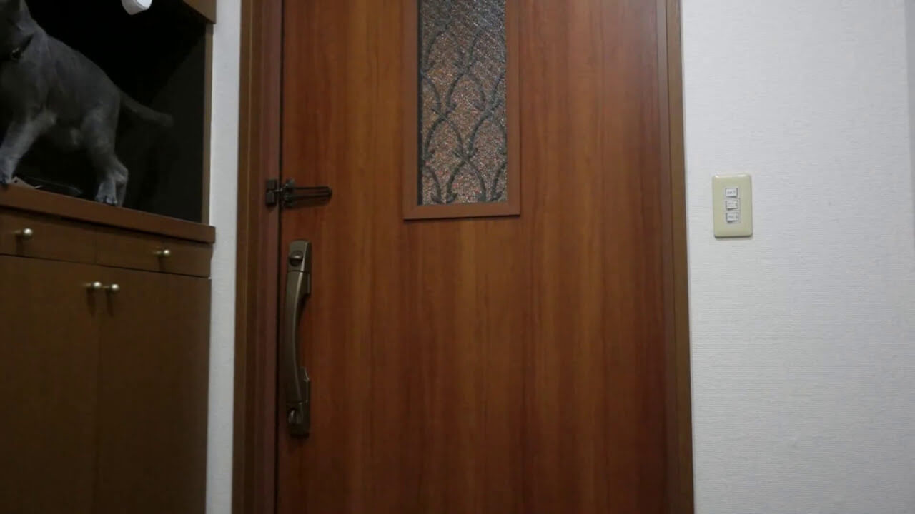 猫ちゃんが玄関収納の上に乗ったかと思ったら、なんと玄関ドアのドアガードを閉めてしまいました。