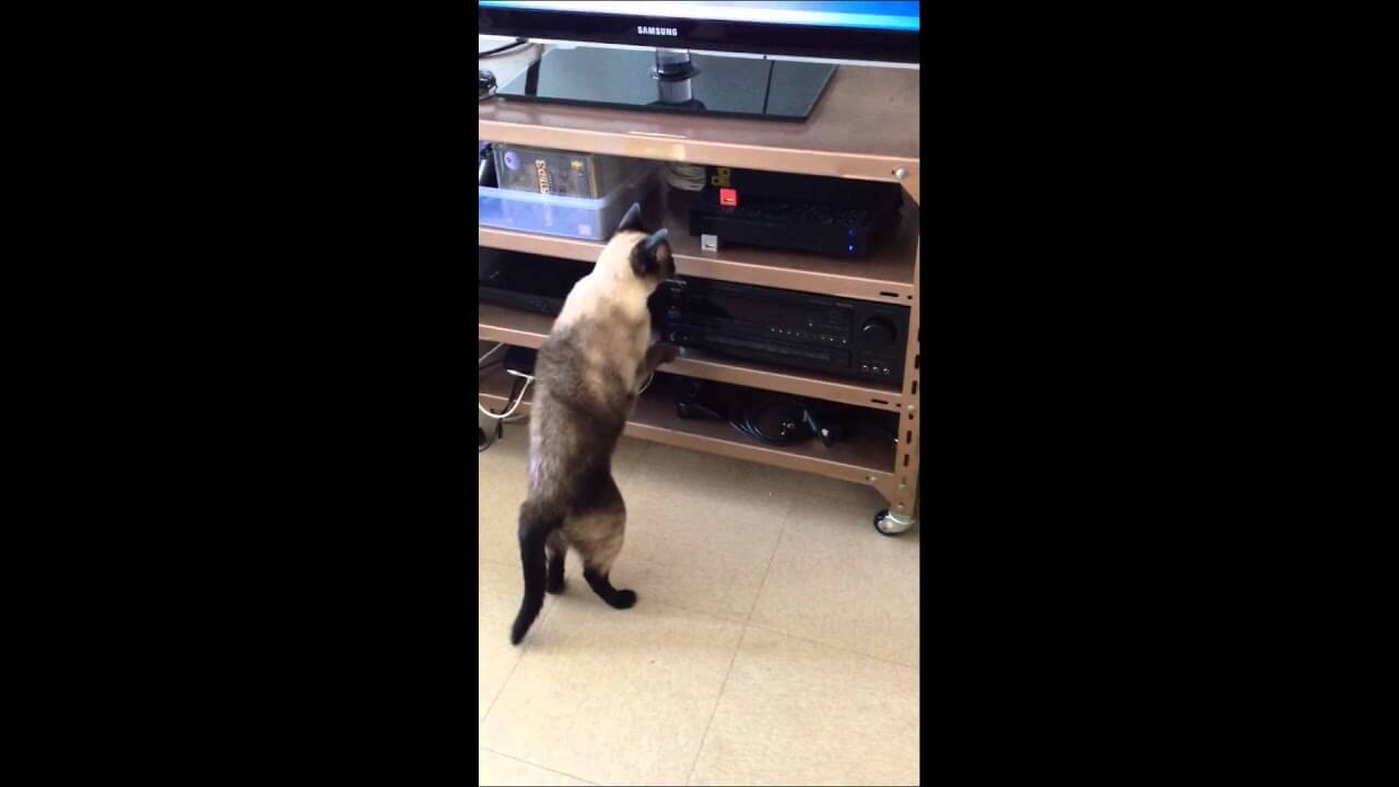 テレビ台に置いてあるDVDプレイヤーからDVDがスーッと出てくると猫さんは、立ち上がって不思議そうにDVDの匂いを嗅ぎはじめます。