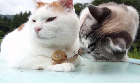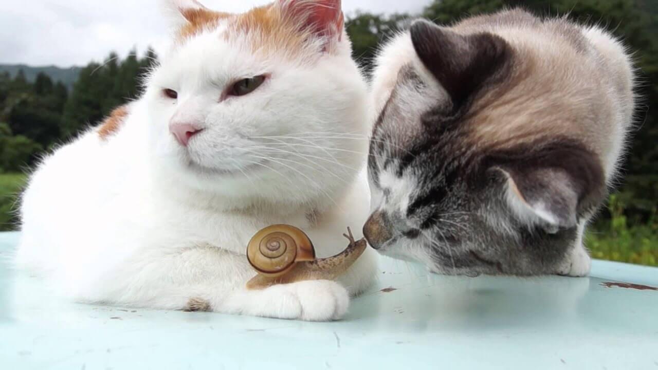 かたつむりのほうも、しろのほうへ顔を伸ばしてとてもフレンドリーに接しています。くろがあまりにしつこくしているので、気を利かせたしろが前足をサッと引っ込めたのでした。