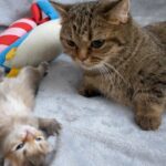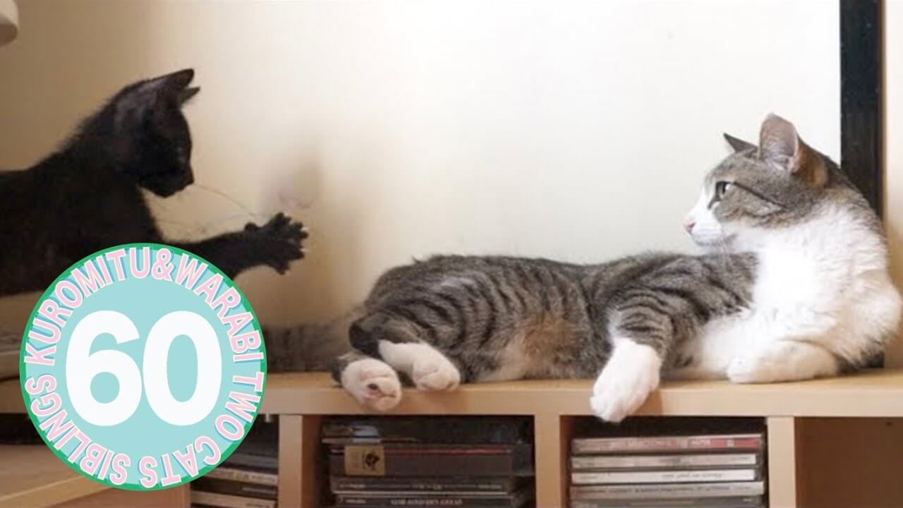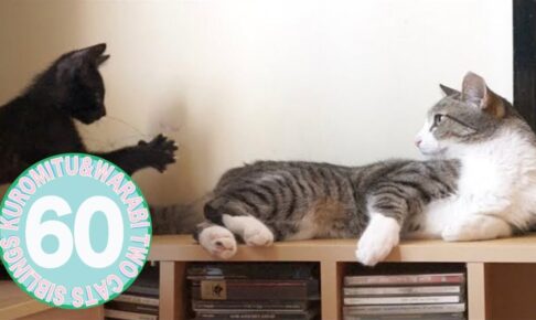 先輩猫のおはぎが棚の上で余裕の表情で寝転がっていると、キャットタワーの部屋のなかから子猫のくろみつが顔を出してきて、おはぎのことを狙ってきます。